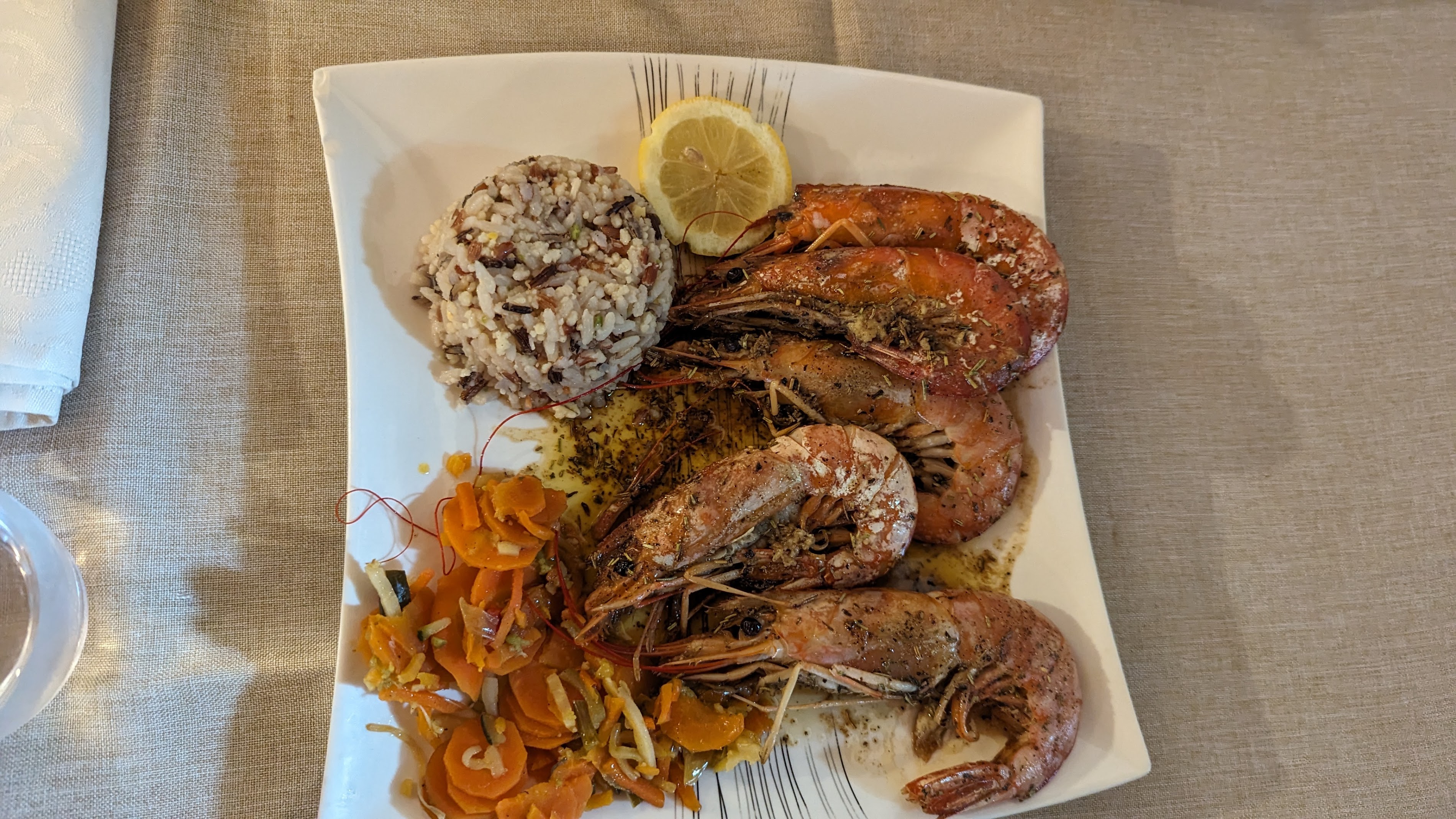 Perfect service for lunch, very good value for money on the menu. The dishes are generous and well presented! However, the rice with the lemon could have been accompanied by a little sauce because it was too dry. The apple-pear gratin dessert with the hot/cold combination was very popular.