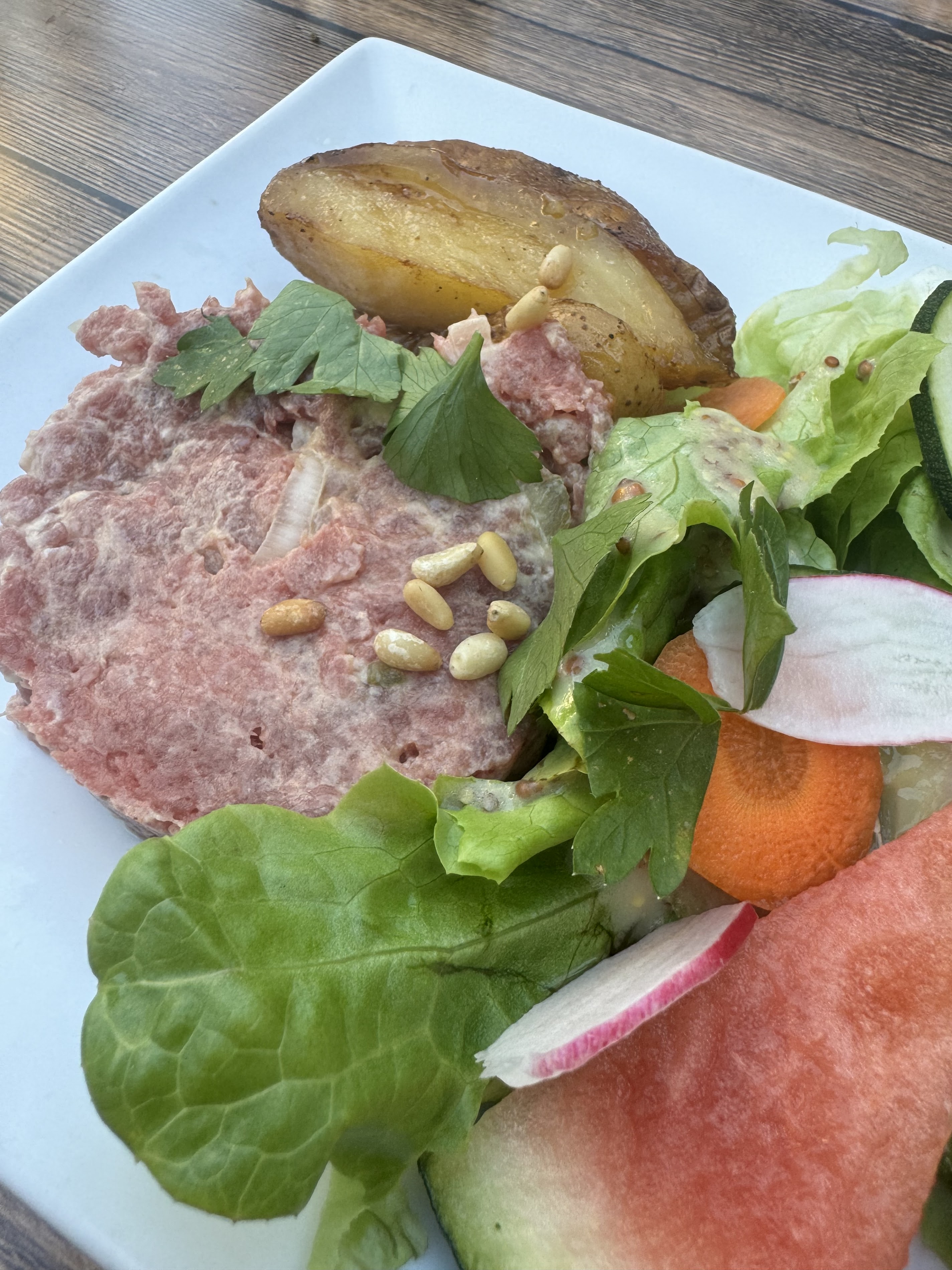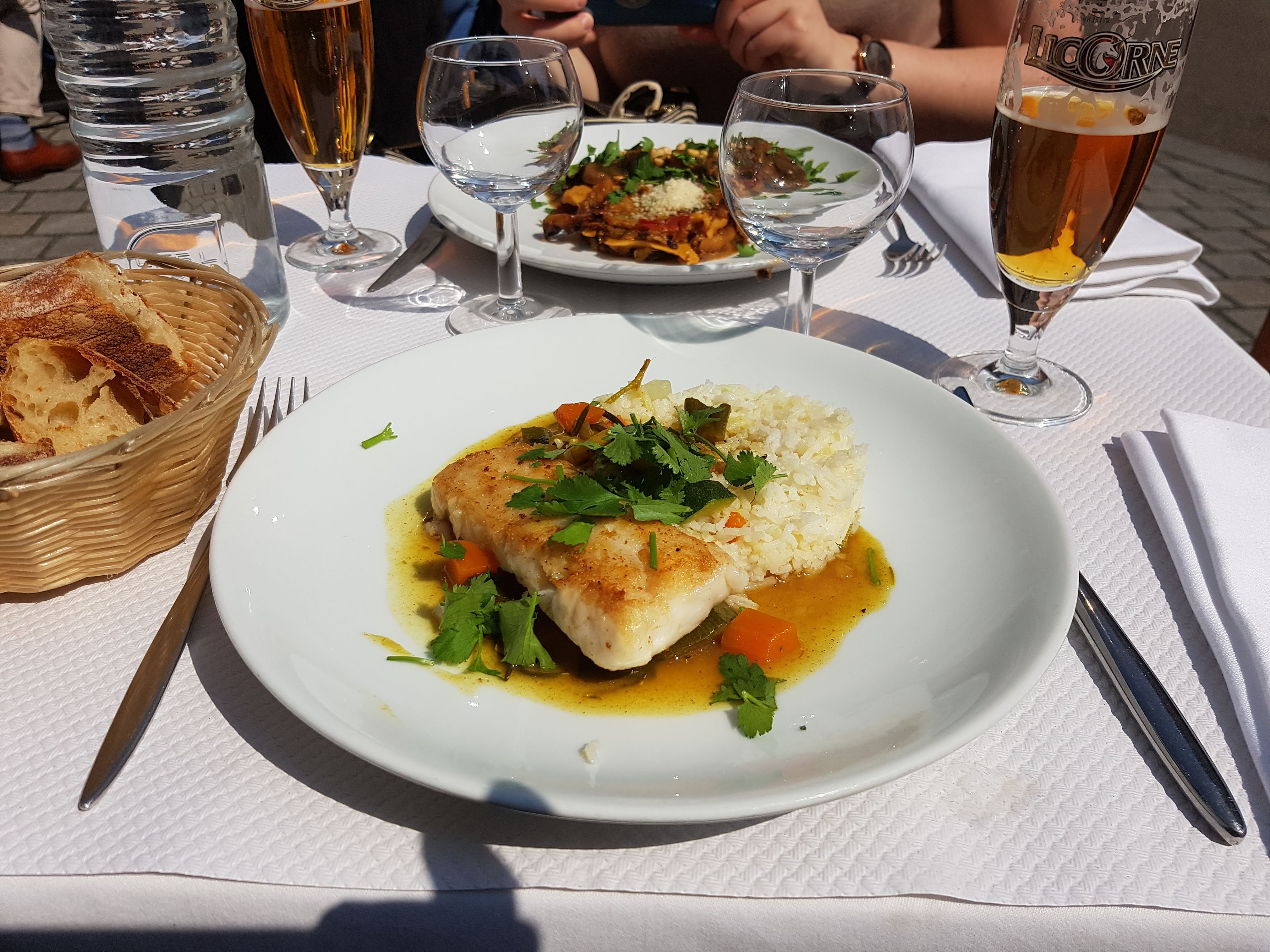 Lovely restaurant with outside seating in the shade in the evening. Vegetarian options a little limited but I had the assiette globe trotter which was delicious. The service was great too, waiters all very nice and accommodating