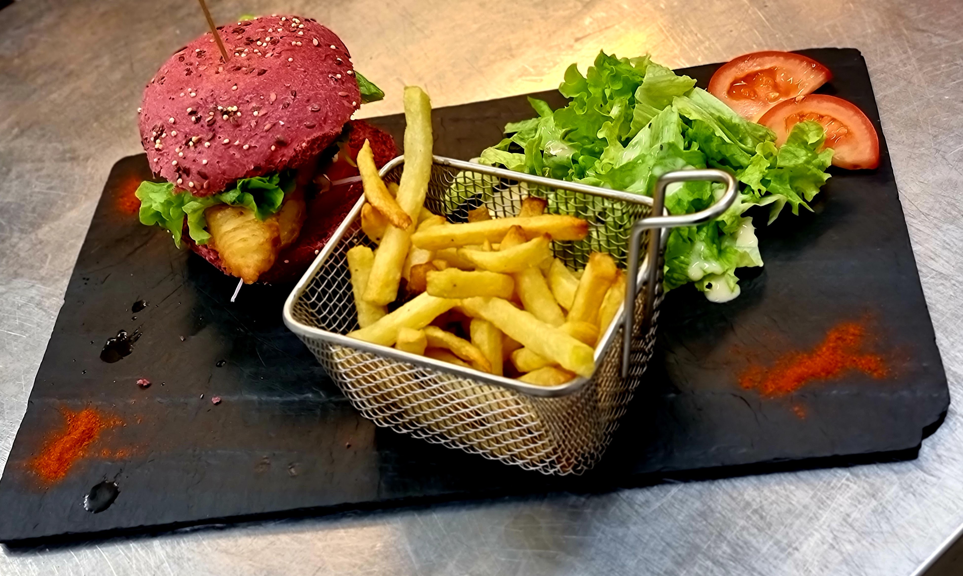 The perfect setting on the terrace outside under the trees. The welcome and the impeccable service and the really good food. The very tender steak and the exquisite chocolate fondant and all that for a reasonable price. Don't hesitate. A big thank you to the knight shooters.