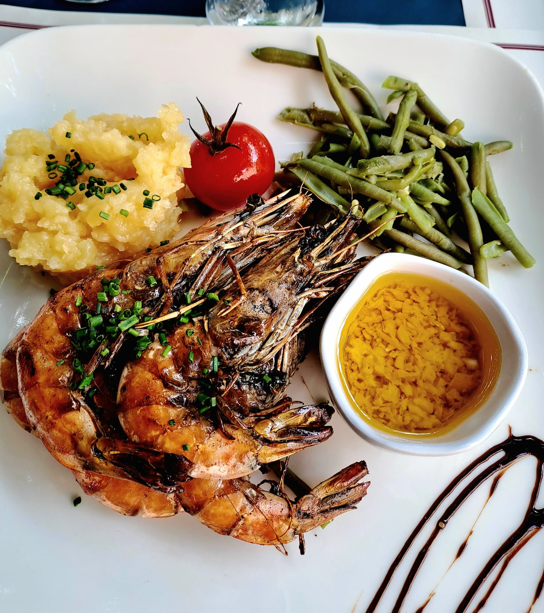 The Grilled King Prawns in Garlic Butter were just that - six very large King prawns in shell pan seared in a parsley, garlic butter with a little pepper blend with extra butter sauce for dipping. A large serving of tender crisp haricot verts was on the side with mashed potatoes full of more garlic butter (no vampires anywhere!) and two succulent roasted yellow tomatoes. A very pleasing, tasty meal!