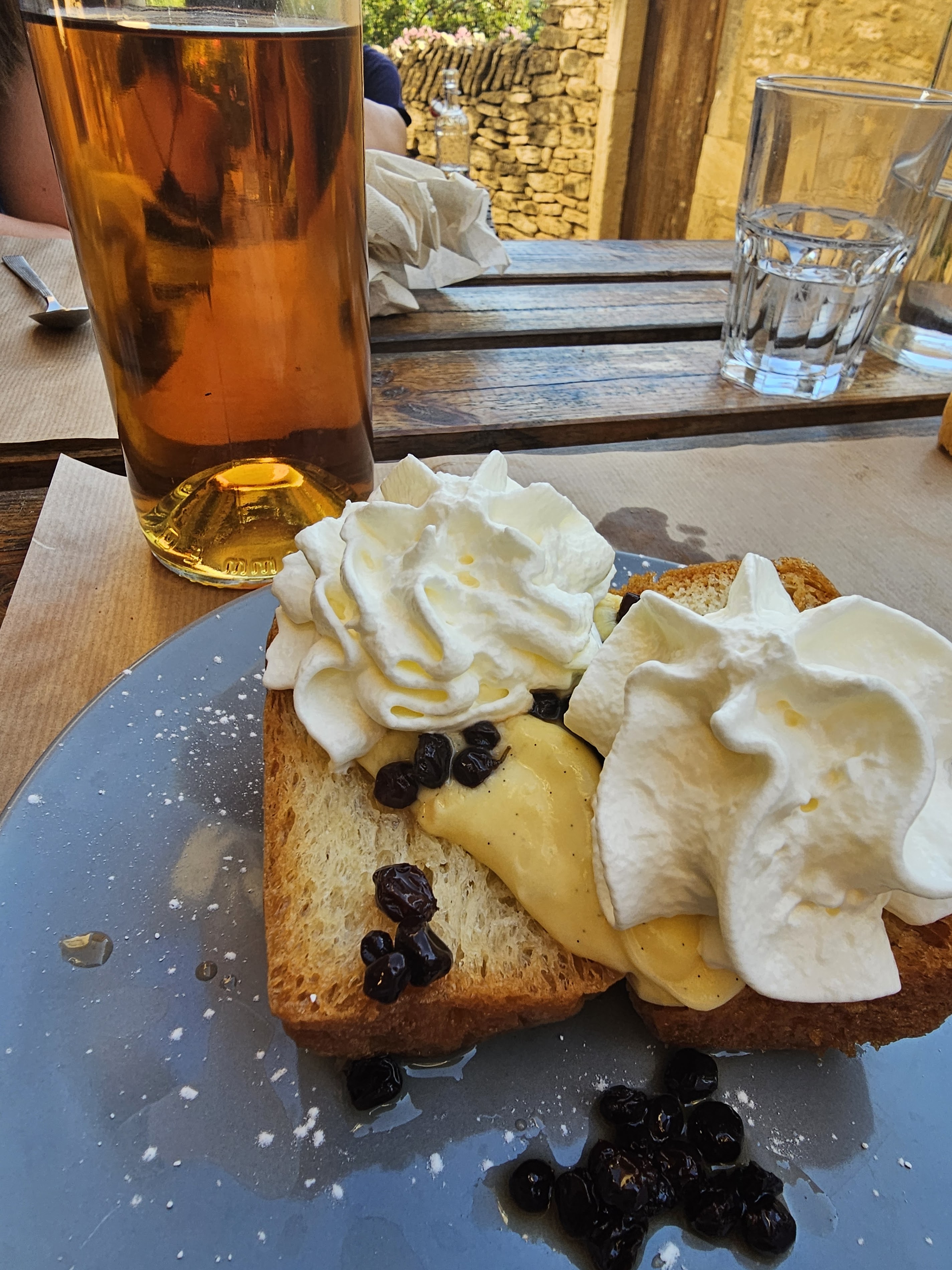 Perfect 10/10 meal in Gordes. The tomato stuffed with tuna was the perfect starter and was so fresh and delicious. The seafood ravioli was AMAZING. Perfectly cooked shrimp and fish, wonderful flavors. Pavlova with local strawberries was the perfect end to the meal, so many different textures and not too rich. I would come back here for every meal until I leave the Luberon Valley if I could. My girlfriend is the best, she knows just what to order. Also top notch service - food comes out quickly but you don’t feel rushed at all and the people who work here are really nice :)