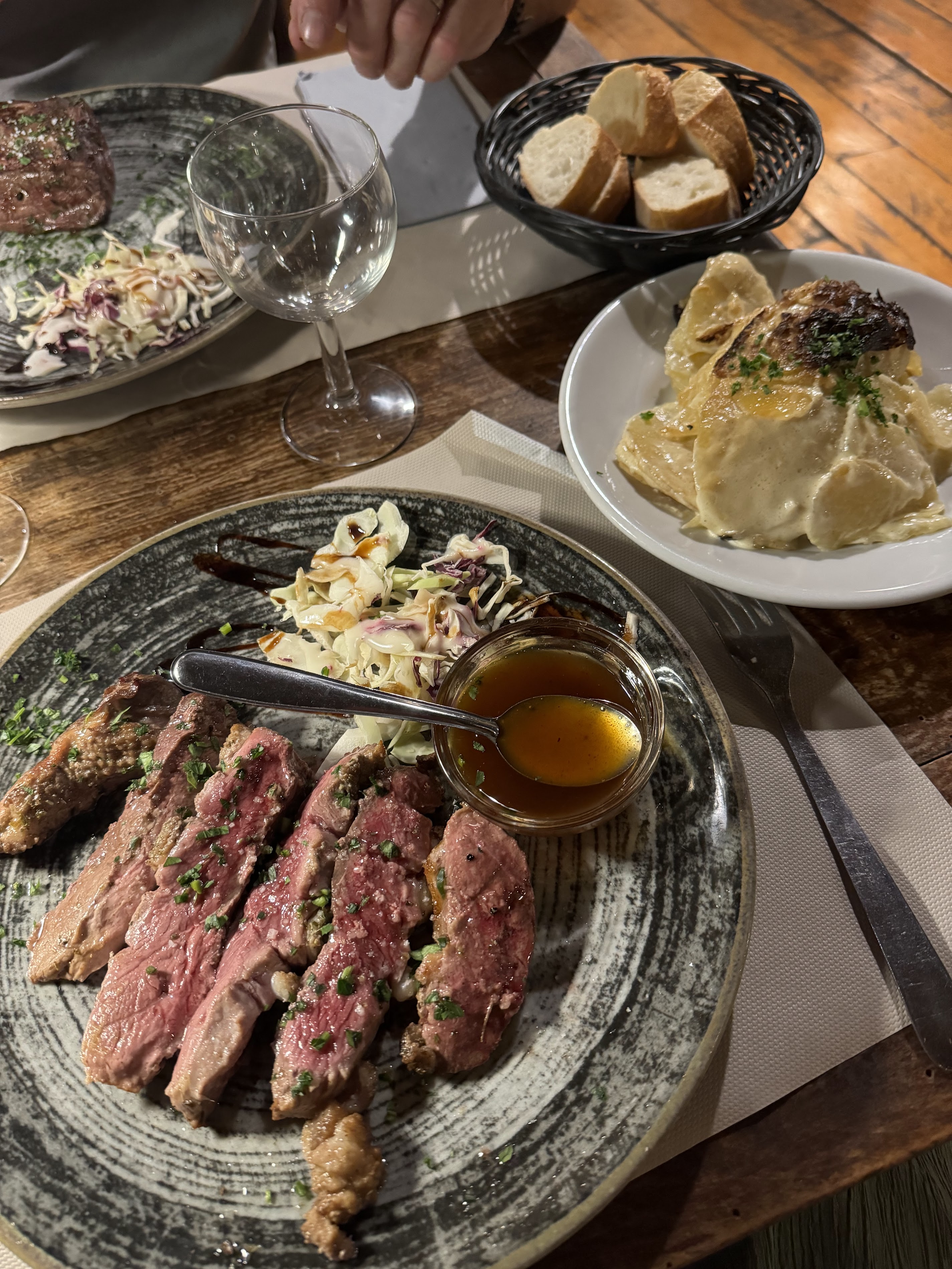 We ordered the filet de bœuf and the côte de bœuf with an assortment of side dishes and sauces. Everything was incredibly tasty and delicious. The gratin dauphinois deserves a special mention, though, because, wow. The calories are worth it!!