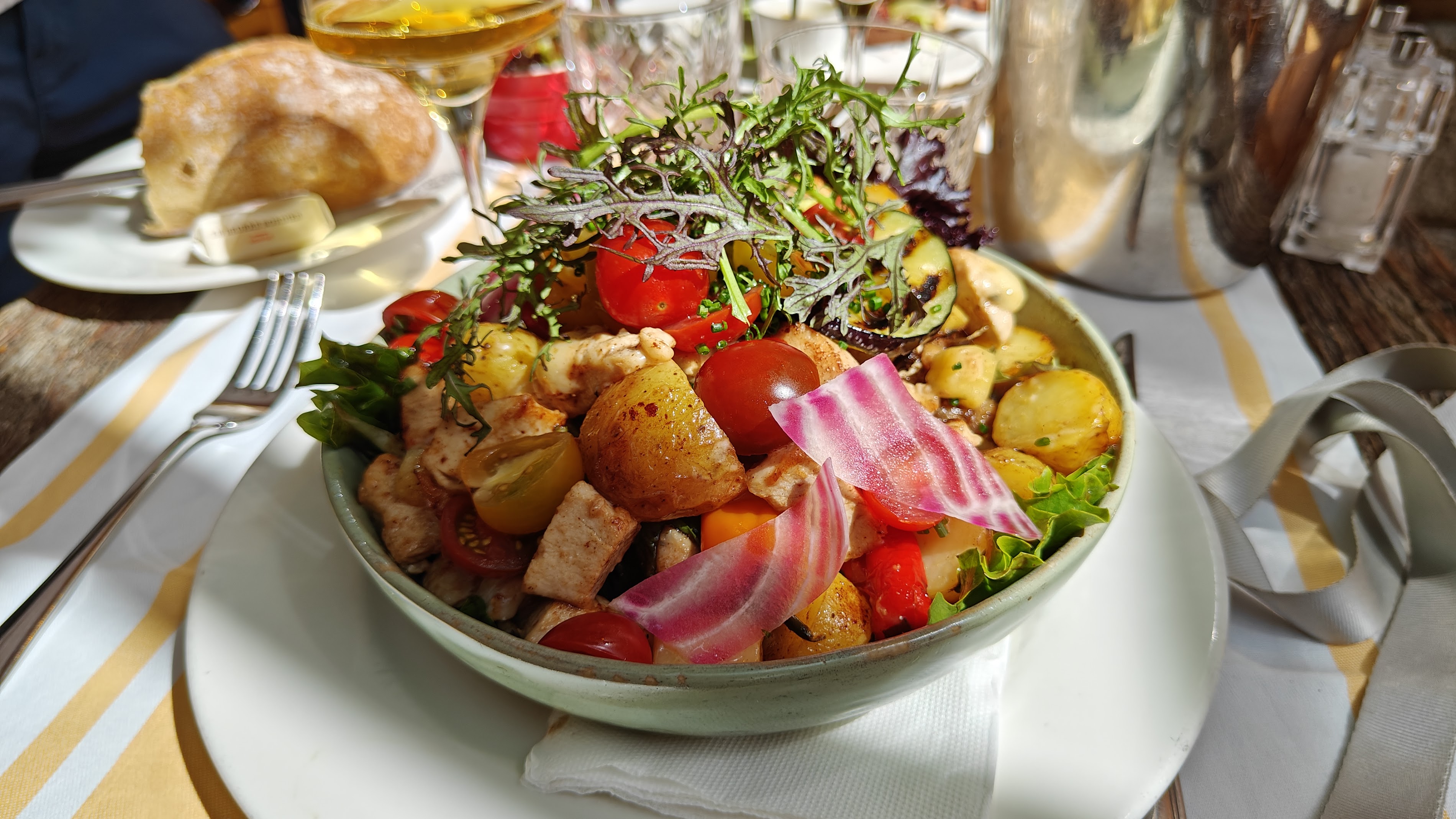 We had the steak and mussels. Normally this cut of steak is know for its tenderness and flavor but it was really tough, I couldn’t chew through the sinew and silver skin, I had to spit out the meat. It was cooked medium but more red than pink. So it definitely was not the cook, it was the cut of meat. The mussels were lukewarm in temperature when they arrived but we don’t send food back, so we ate what we could and left. The flavors were ok. It was a nice presentation and the staff were really nice. If you eat here don’t sit inside near the bar/kitchen it was unbearably loud. My ears hurt sitting there….they wash the dishes at the bar. For the price you pay, it’s not worth it.