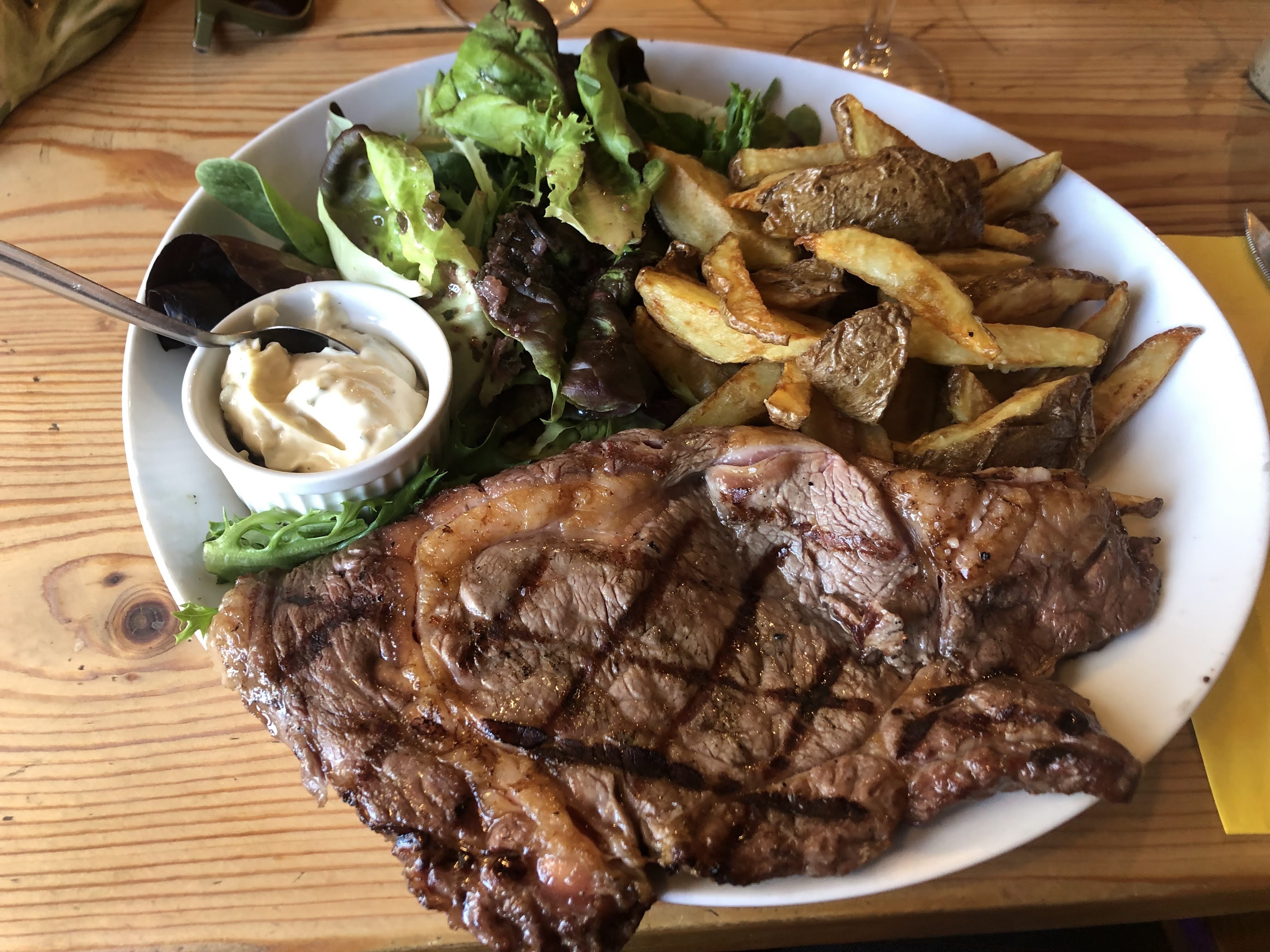 The atmosphere and music is vibrant. Good wine and calvados.