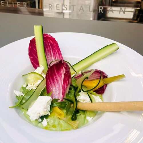 Atelier Salone, the bistronomy sibling of Villa Salone, is lavished with attention by Alexandre Lechêne, a chef with a stellar CV (Aux Lyonnais, Louis XV in Monaco) and formerly Michelin-starred in Saint-Véran (Hautes Alpes département). On the day of our visit, the menu included slow-cooked organic egg with pumpkin and truffles, a delicious vol-au-vent and a chestnut and blackcurrant mont blanc dessert with chestnut ice cream. The original style of this early-20C building is underscored by contemporary details.