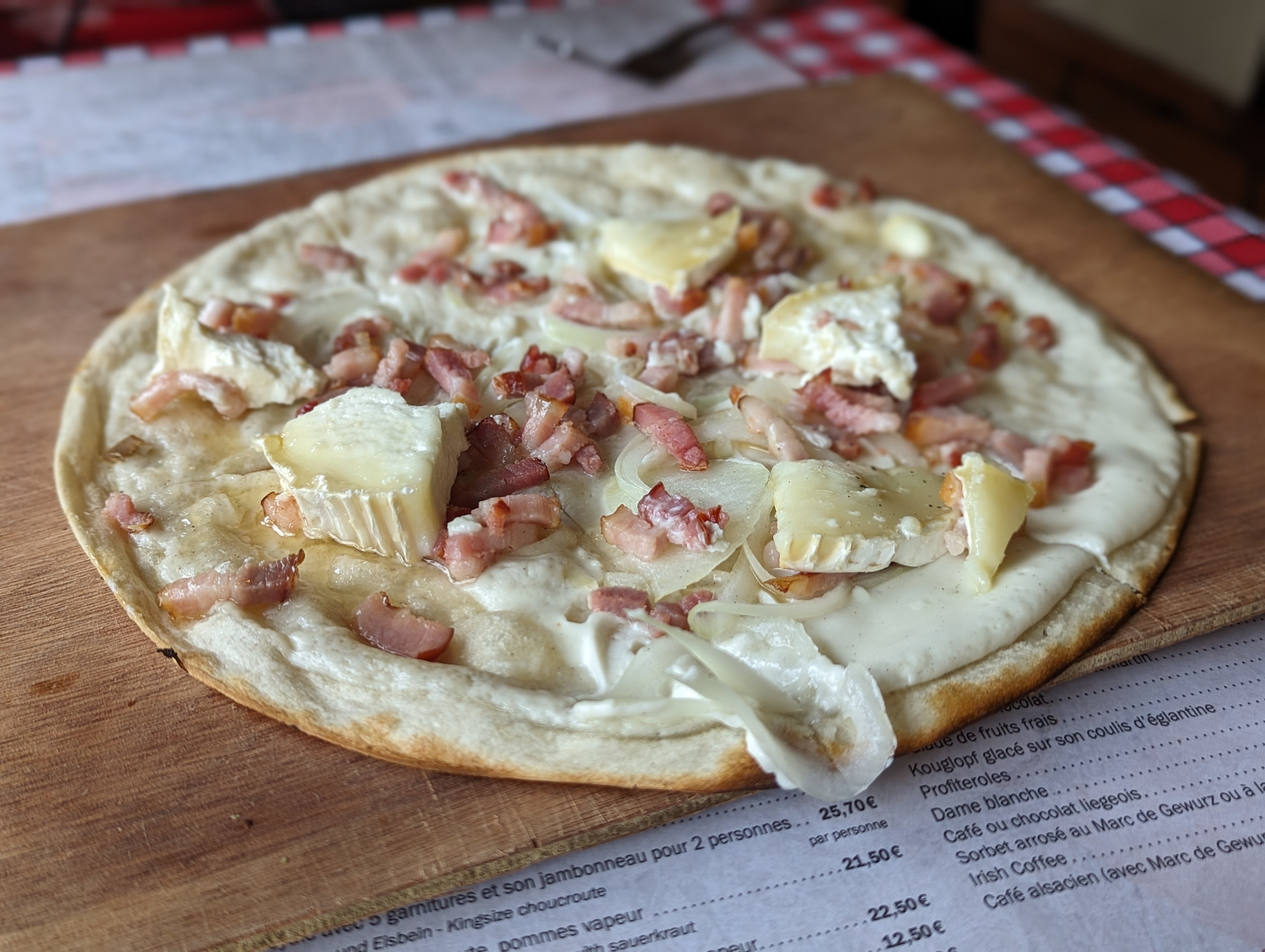 After seeing the 3.5 star rating, we were a little sceptical but decided we would go in with lower expectations, which were completely exceeded! We arrived right at their dinner opening as walk-ins. There was a group of 14 that had reserved the whole bottom floor outdoor terrace, so we were instead led upstairs and seated at a window seat, which we were happy about. My friend and I decided to split a small tarte flambee au Munster and each get a glass of gewurztraminer. I also ordered cordon Bleu, which came with a side salad and fries, and my friend ordered the onion soup. The gewurztraminer was delicious and the tarte flambee was the best we had during our visit, which I credit to their Munster cheese! My friend thought her onion soup was a little watery but I really enjoyed the cordon bleu