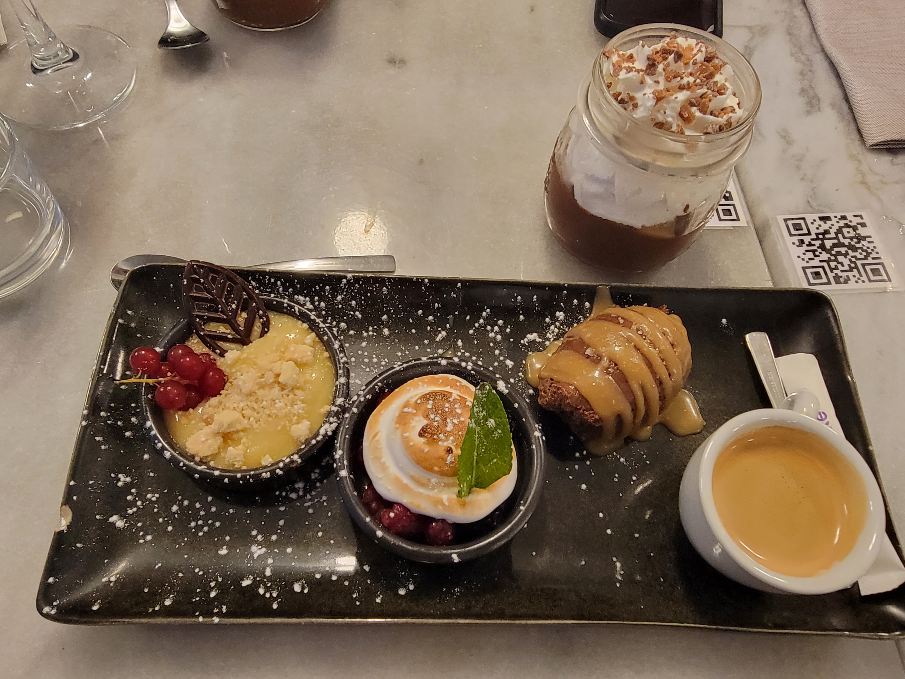 We had a early reservation so the restaurant was empty but what a beautiful place. The host/waitress/bartender was amazing. She was super friendly and professional. We really appreciated speaking English my French is terrible. FIrst was the cocktail list had a great selection. I went with the French passion, excellent drink with beautiful presentation. We had the tempura shrimp and lamb samosas, both came out fast and were delicious. The mains we had were monk fish burger and pork filet mignon both cooked to perfection. The monk fish is definitely a acquired taste, not something I was use to. The dessert was chocolate mousse, so good, very rich. Excellent dinner for our last night in France!